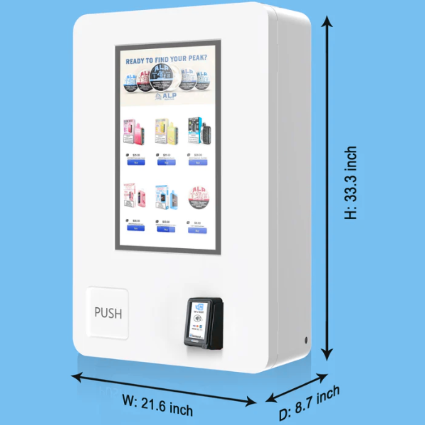 The Mini Wall is the most affordable and compact vending unit in the lineup, designed for venues where floor space is at a premium. Its ultra-slim profile, reliable performance, and modern touchscreen make it an ideal entry point for bars, restaurants, and lounges looking to offer vape products without sacrificing style or space.